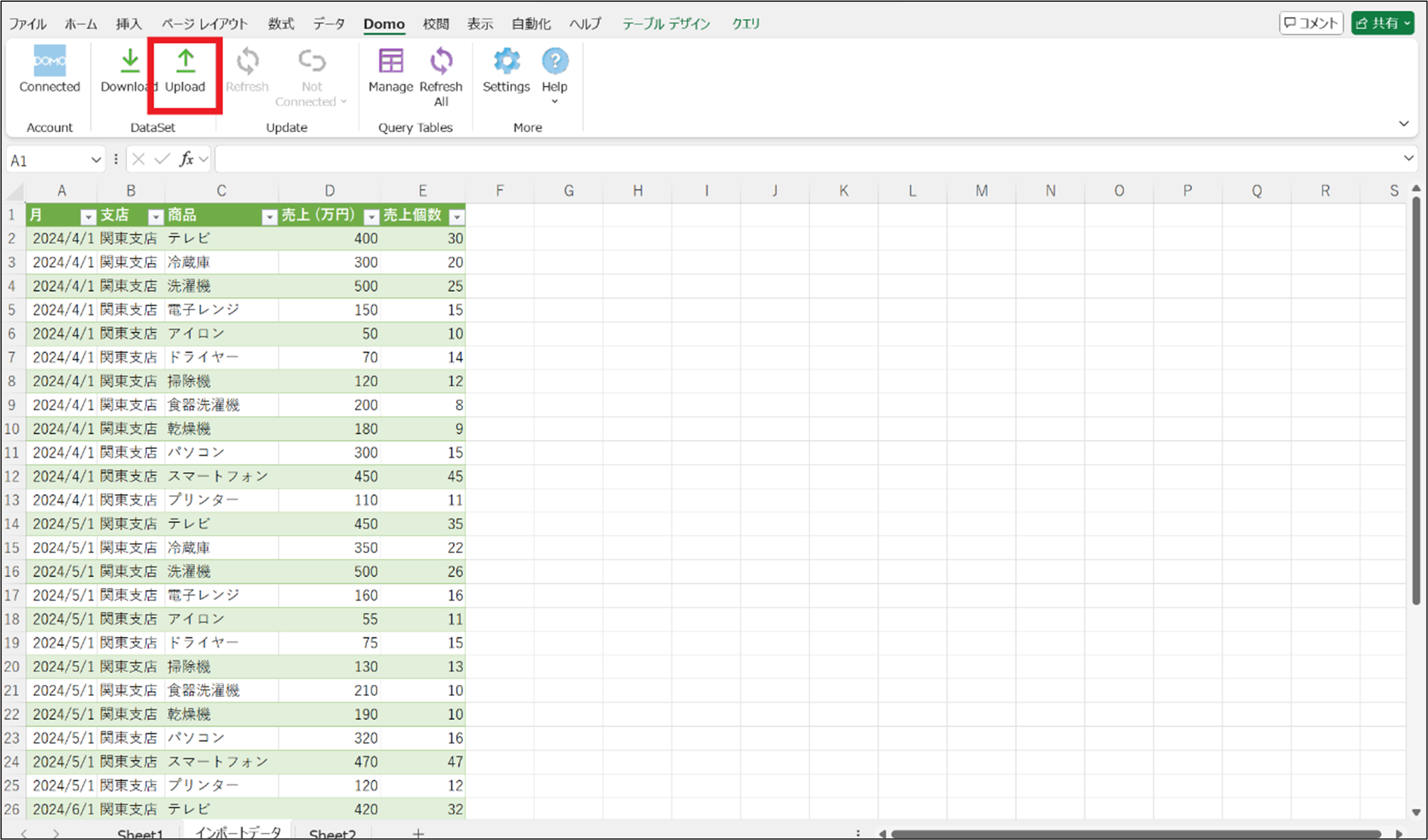 ここまではDomoのデータをExcelへ取り込む方法について解説しましたが、次にExcelからDomoへデータをアップロードする方法について説明します。