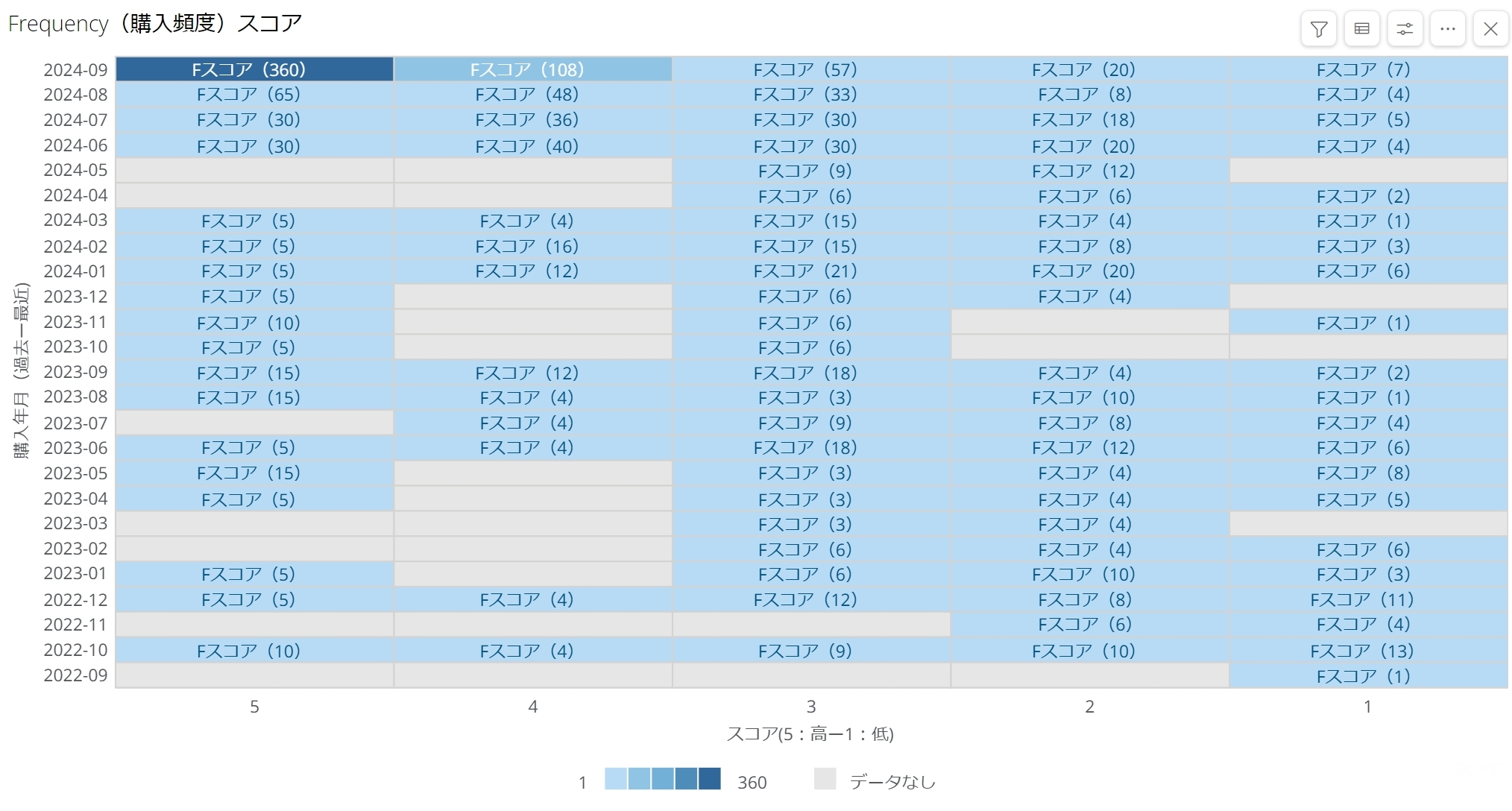 一定期間内に顧客が購入した回数。頻繁に購入する顧客は、ブランドに対するロイヤルティが高いと見なされる。 |