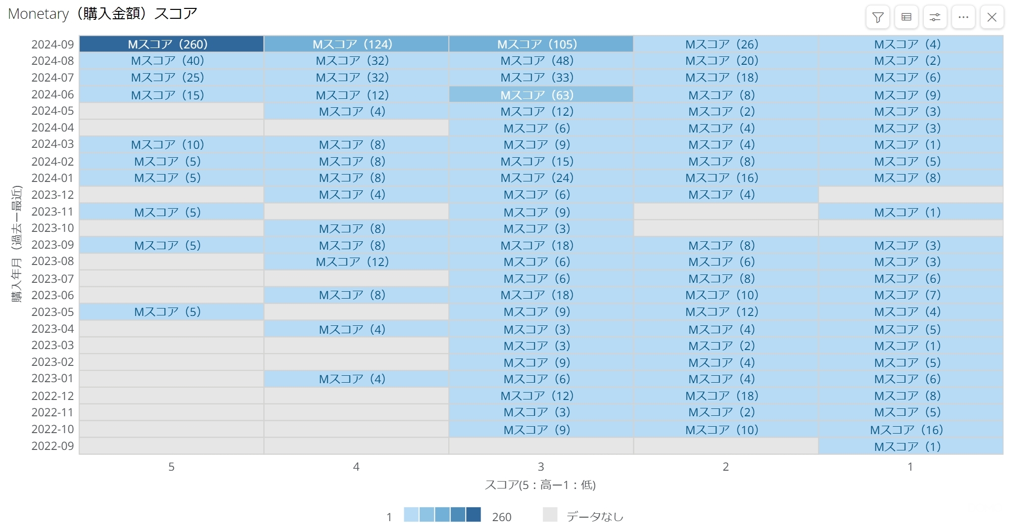 一定期間内に顧客が使った総金額。高額を使う顧客は、企業にとって価値の高い顧客とする |