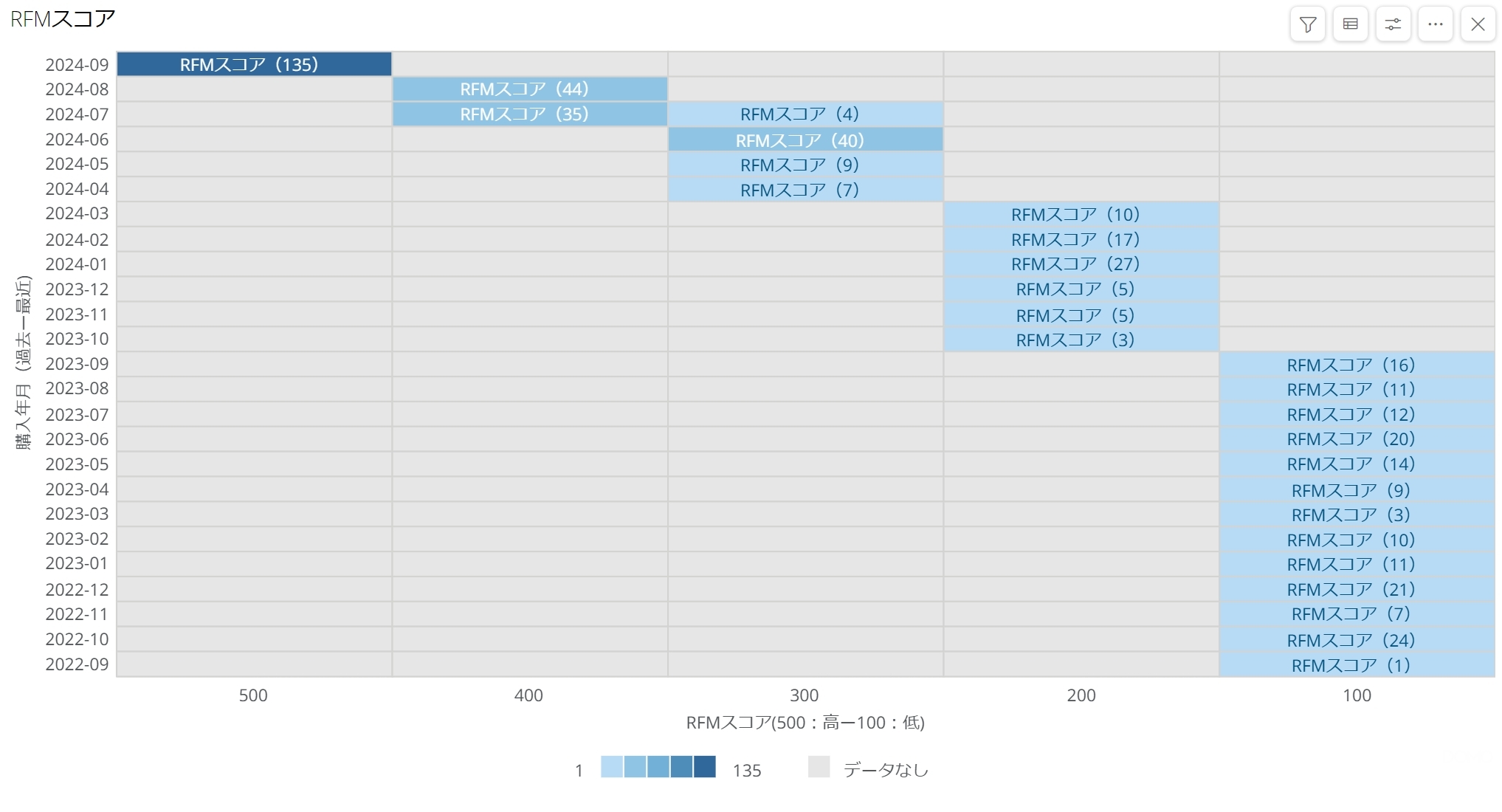 バブルチャートで、Recency(最新購買日)を横軸、Frequency(購買頻度)を縦軸、バブルの大きさをMonetary(購買金額)で表せば、細かいセグメント作成をする場合にも利用しやすくなるでしょう。